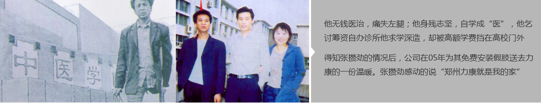 鄭州市力康假肢矯形器有限公司(簡稱力康),是一家專業從事假肢矯形器的設計、研發、制作及裝 配的專業機構。成立于1992年是河南省唯一一家福利企業。力康下設業務部、技術部、住院部、康復 部、售后服務部,并配有現代化的裝配車間和功能齊全的訓練大廳,為殘疾朋友康復訓練提供了可靠 保障。總經理穿戴假肢多年,有著豐富的臨床經驗和親身體會;多年來,力康已為全國幾十萬名殘疾 朋友安裝上舒適、美觀、耐用的假肢和矯形器具,使他們更大限度地恢復了正常的工作和生活。“產 品即人品”的質量理念、先進的技術、實惠的價格、完善的售后服務是力康取勝的法寶……